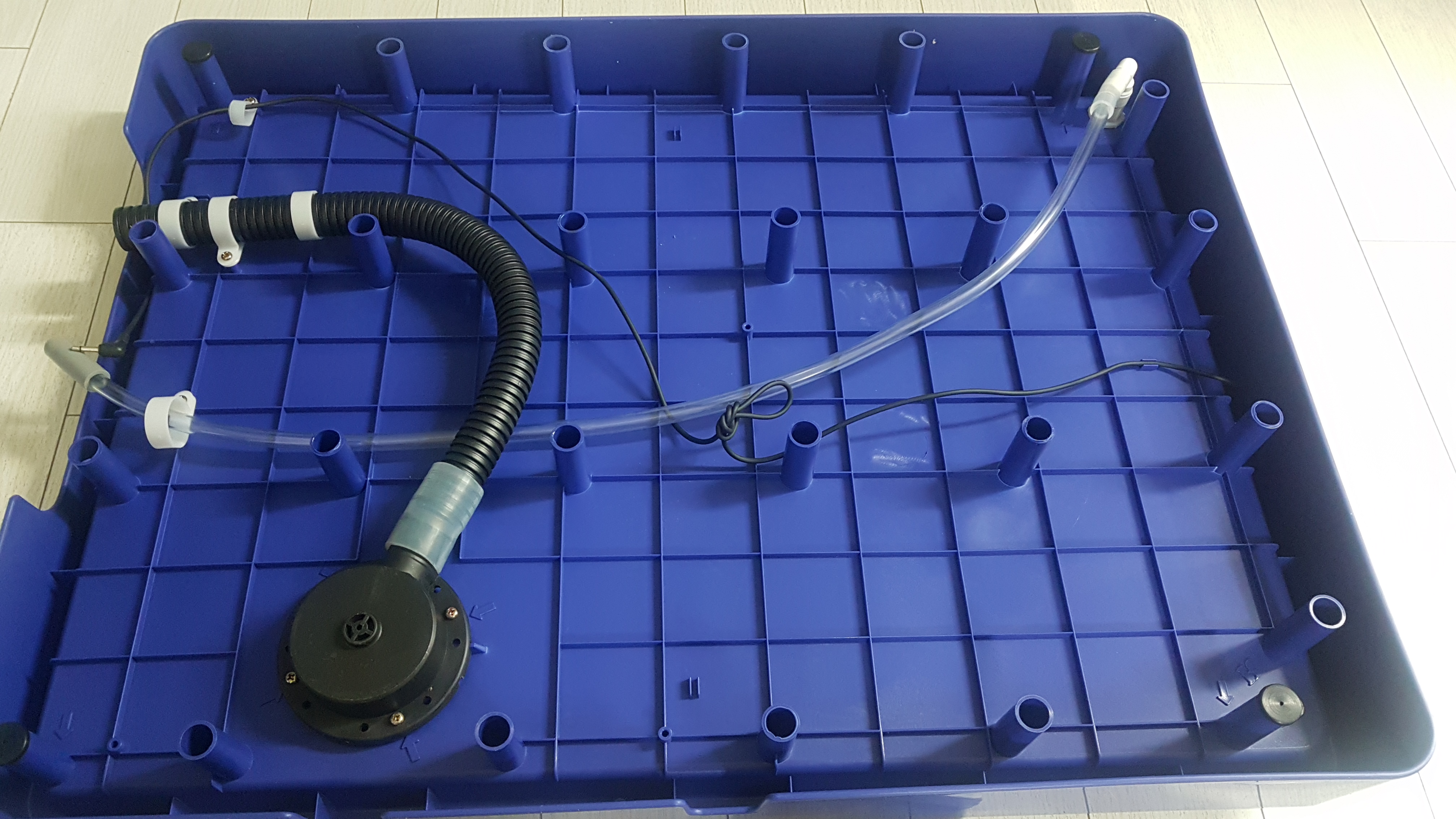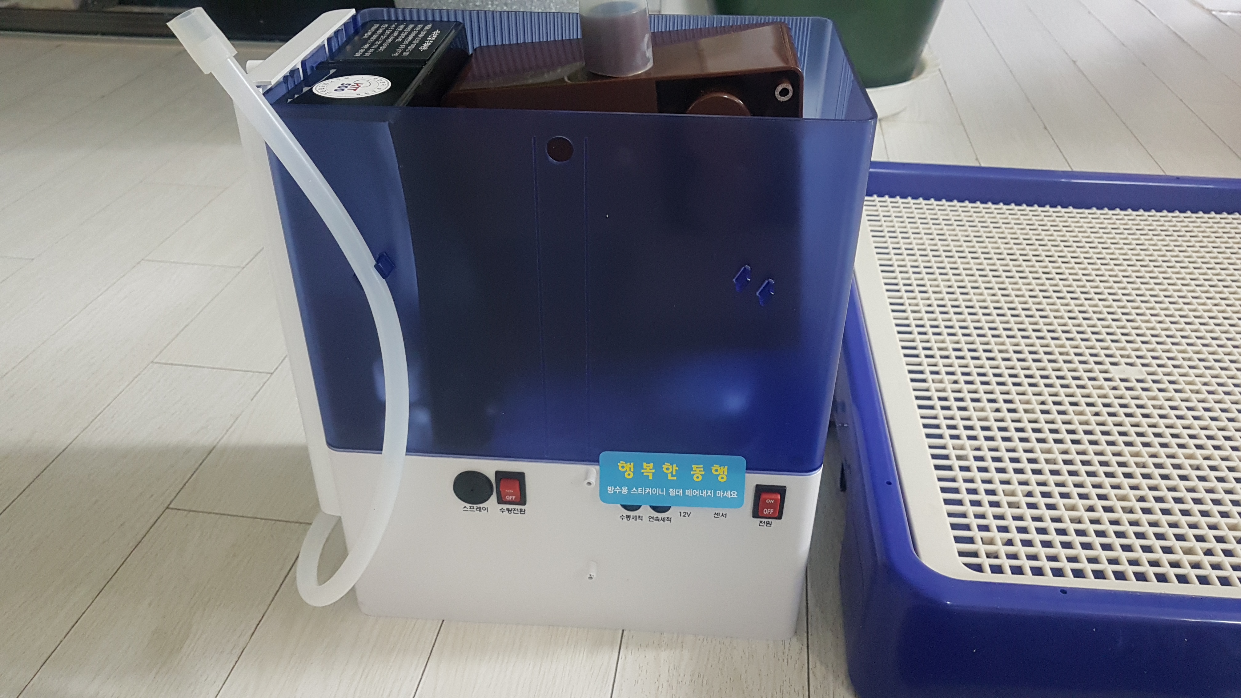 이곳에 물을 저장해서 흘려 보내는 방식인데 저희 변기통 뒷부분과 같은 역활을 하고 그리고 강아지가 올라갔을때 센서를 감지해 볼일이 끝난뒤 약 2분후 물이 나오면서 쉬를 흘려보내주는 역활을 합니다