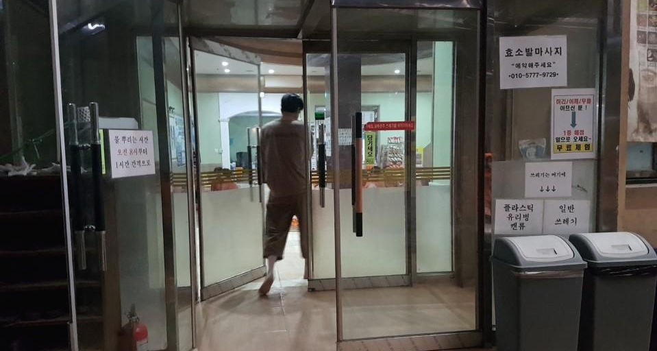 외부 숯가마 찜질시설로 나가는 문입니다 느낌상 건물 외부에 땅을 사서 숯가마 시설을 만들지 않았을까 하는 생각이 들 정도로 외부 시설은 약간 허술한 느낌이 들었습니다