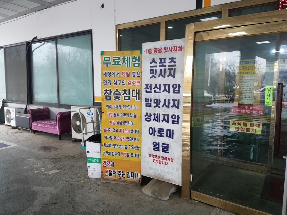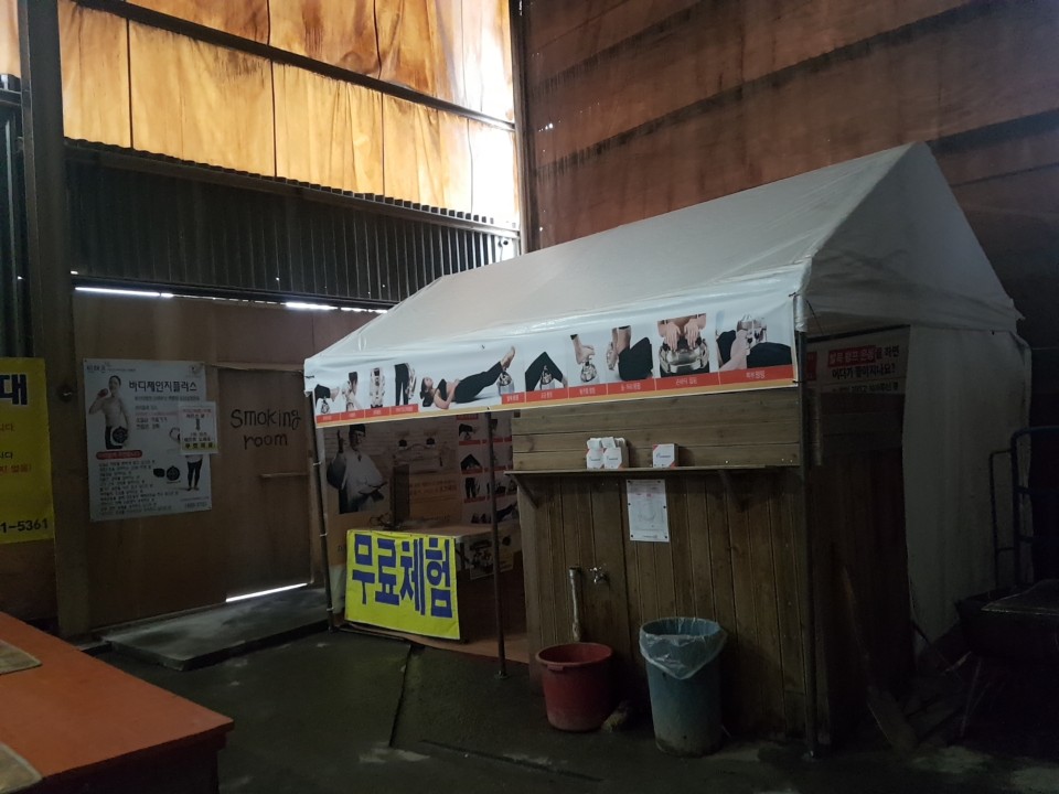 무료체험이라고 되어있는곳은 뭔지 모르겠지만 사람이 많이 없어서인지 운영하지 않고 있었고 뒷편에 보니 야외로 나갈수 있는 문이 있었는데 평상도 있어서 찜질 중간중간 바람쐬러 나가기에 좋게 되어있었습니다