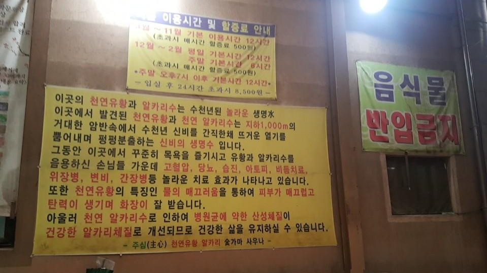 이곳의 자랑 천연유황 알칼리수에 대한 홍보를 하고 있습니다 음식물 반입 금지라고 되어 있는데 군고구마 가래떡 구이는 다 해드시고 싸오신 음식을 드시기도 했습니다