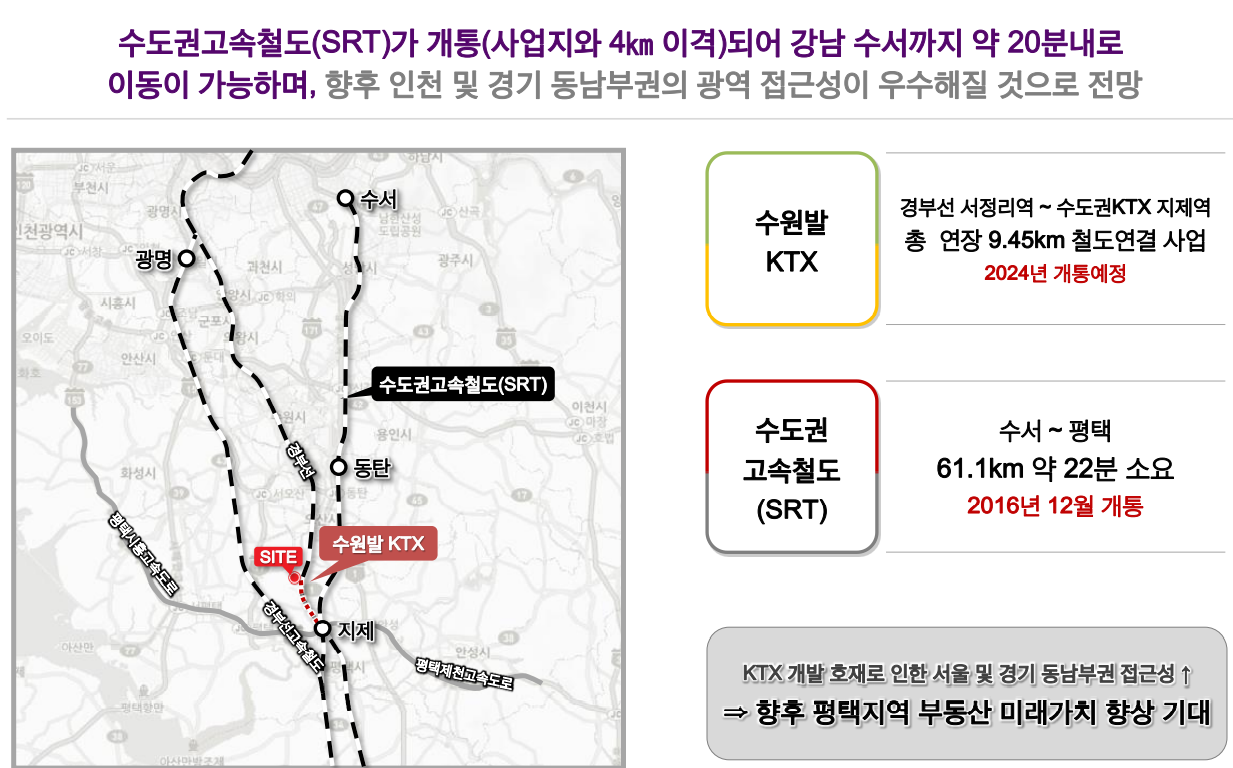 특히 지제역의 경우 지하철 1호선과 강남수서로 18분대로 도달하는 SRT 2024년 개통하는 수원발 KTX 까지 트리플 역세권의 위상을 더하게 됩니다