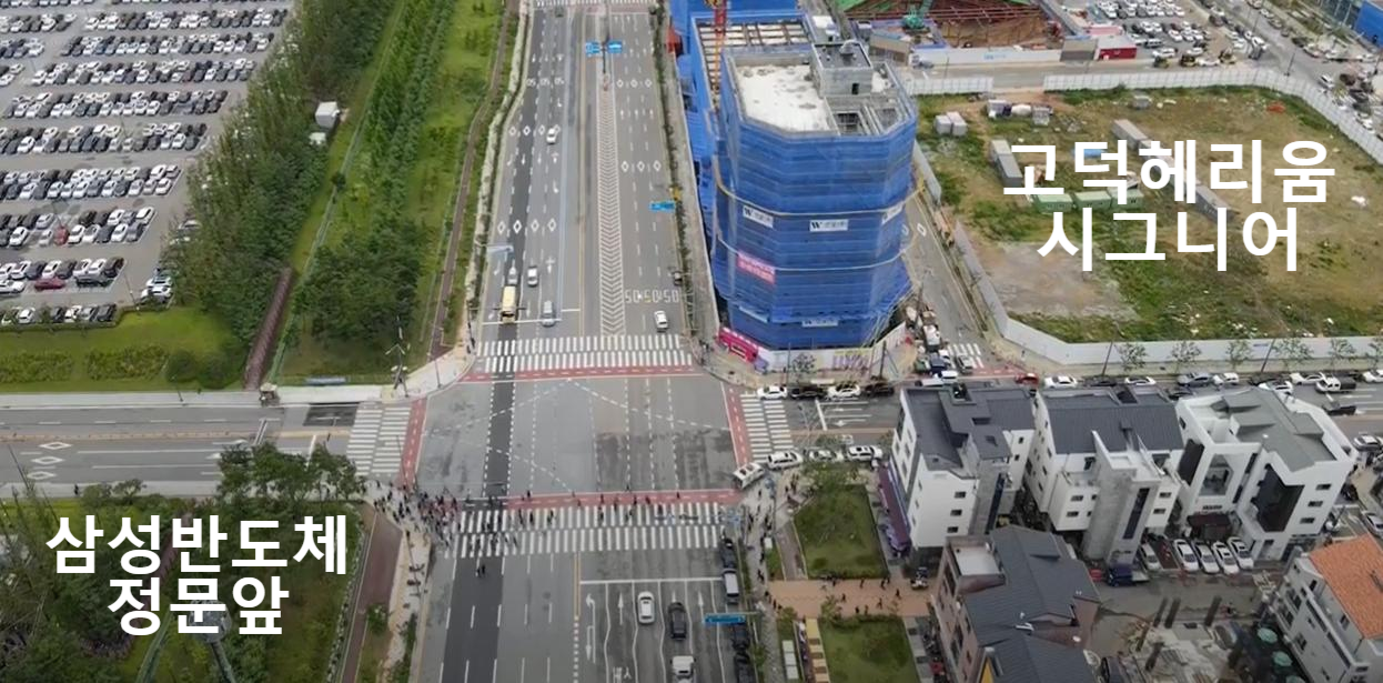 고덕헤리움시그니어 정확한 위치는 삼성전자 평택캠퍼스 메인사거리에서 정문까지 도보 90m 거리에 위치해 있습니다
