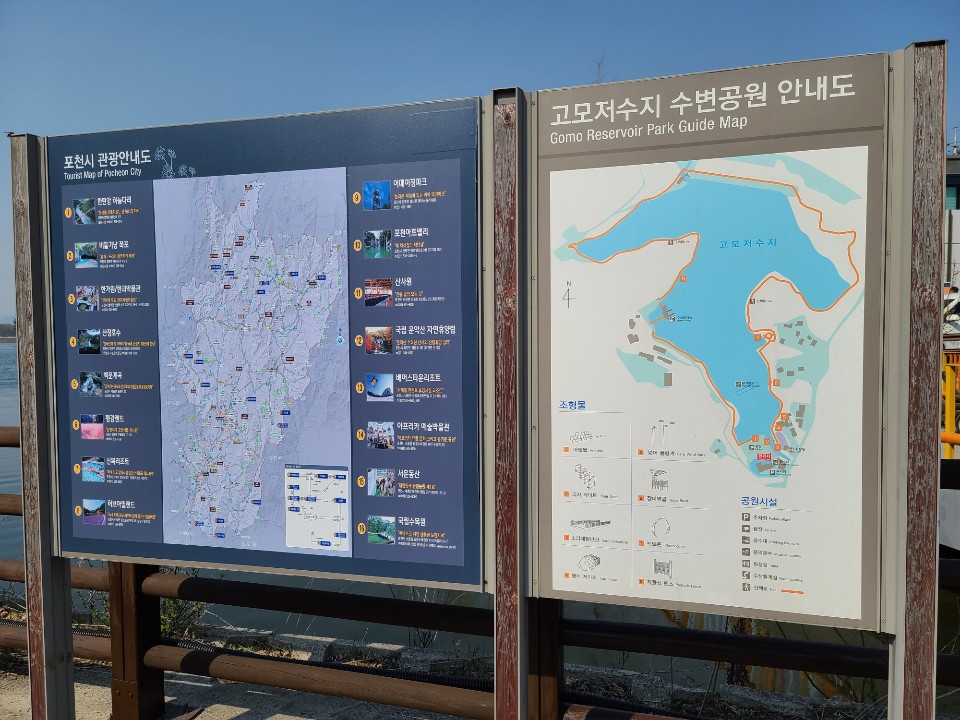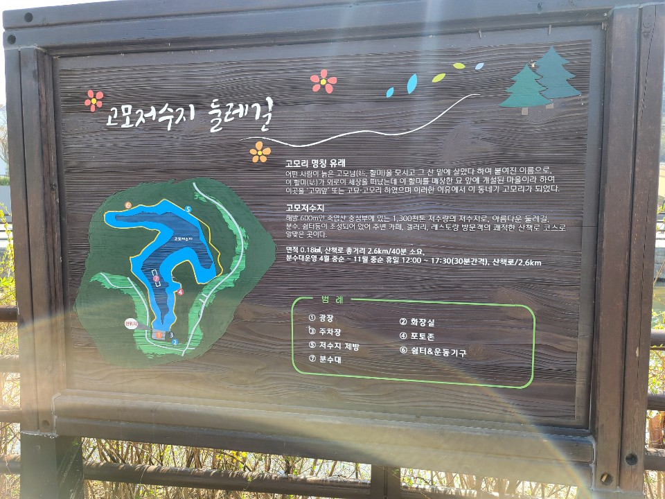 고모리저수지 산책길은 산책로 총거리 2.6km로 40분정도 소요된다고 나와있습니다 천천히 구경하고 걷다보니 실제로 한시간 정도 시간이 소요되었습니다 저수지둘레길 내에는 분수대로 운영된다고 하는데 고모리저수지분수대는 4월중순부터 11월중순 휴일 12:00- 17:30분 동안 30분간격으로 운영된다고 합니다