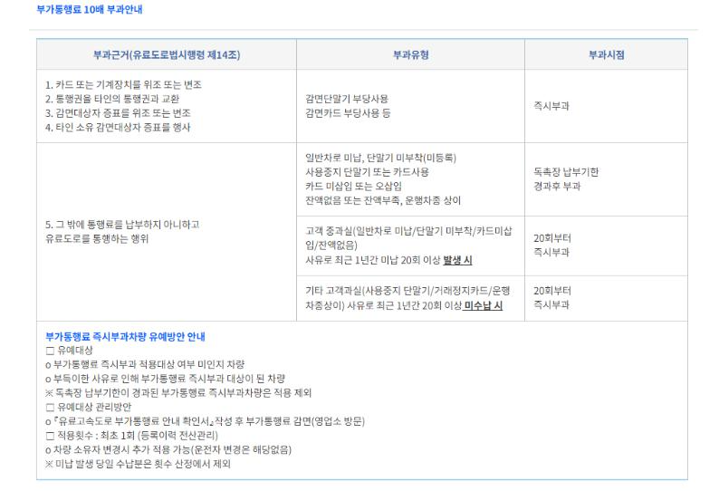 그 외 고객 중과실 - < 일반차로 미납 , 단말기 미부착, 카드 미삽입, 잔액 없음 >등의 사유로 1년간 20회 이상 발생 시 20회부터는 즉시 10배의 요금이 부가되며 기타 고객 과실 < 사용중지 단말기, 거래정지 카드, 운행 차종상이>의 사유에도 20회부터 즉시 부가되니 참고하시기 바랍니다