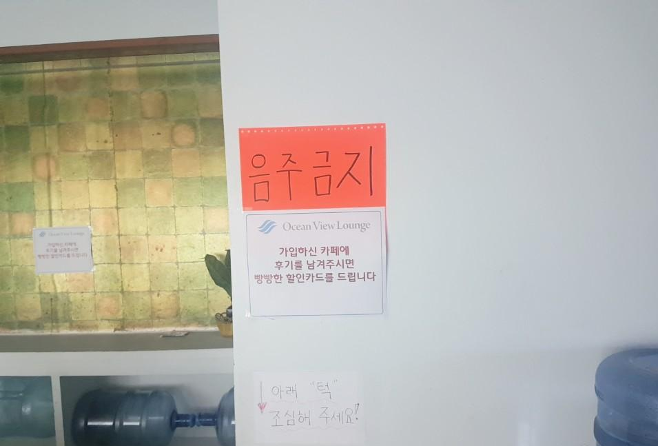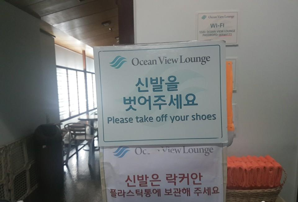 오션뷰 라운지 안에서는 신발을 벗으셔야 합니다 화장실을 가시거나 바깥출입시 신을 수 있는 슬리퍼가 구비되어 있었습니다 신으셨던 신발은 락커안에 보관하시면 됩니다