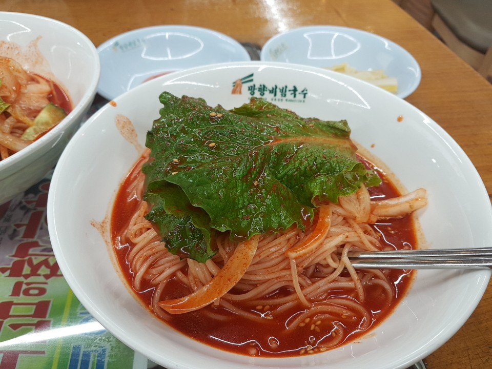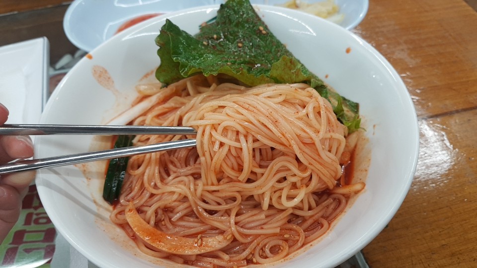 새콤한 양념맛이 참 중독이 있습니다 비빔국수 안에 양파 상추 백김치 오이 깨 등이 들어가 있습니다 양도 푸짐한편입니다 개인적으로 면발은 조금 굵어서 아쉬웠습니다