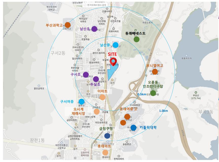 또 빠질 수 없는 학군이죠! 두실초등학교 도보 2분거리, 구서초, 남산초, 장서초등학교도 가까이 있으며 남산중, 구서여중, 동래여중, 동래여고, 브니엘고, 예술고, 부산과학고등 자녀교육에는 걱정 하실 필요가 없을 정도로 초중고가 다 인접해 있습니다 그외 부산 외국어대와 카톨릭대도 반경 1km에 위치하고 있습니다