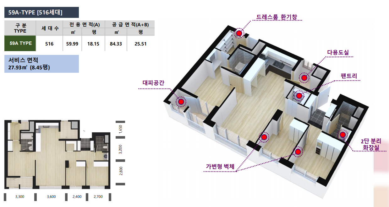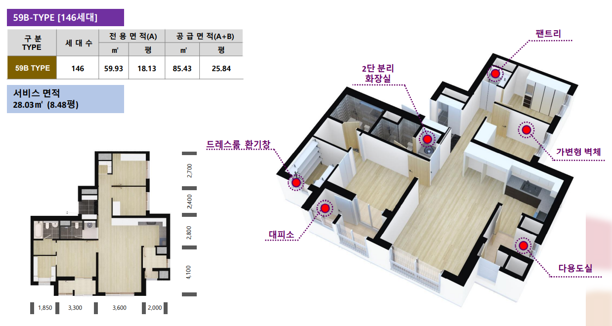 59㎡ 의 경우 A타입과 B이 제공되는데 둘다 서비스면적이 28.03㎡ 로 약 8평가량 적용 됩니다 소평 평수이지만 공간활용이 매우 돋보이는 구조로 설계되었습니다