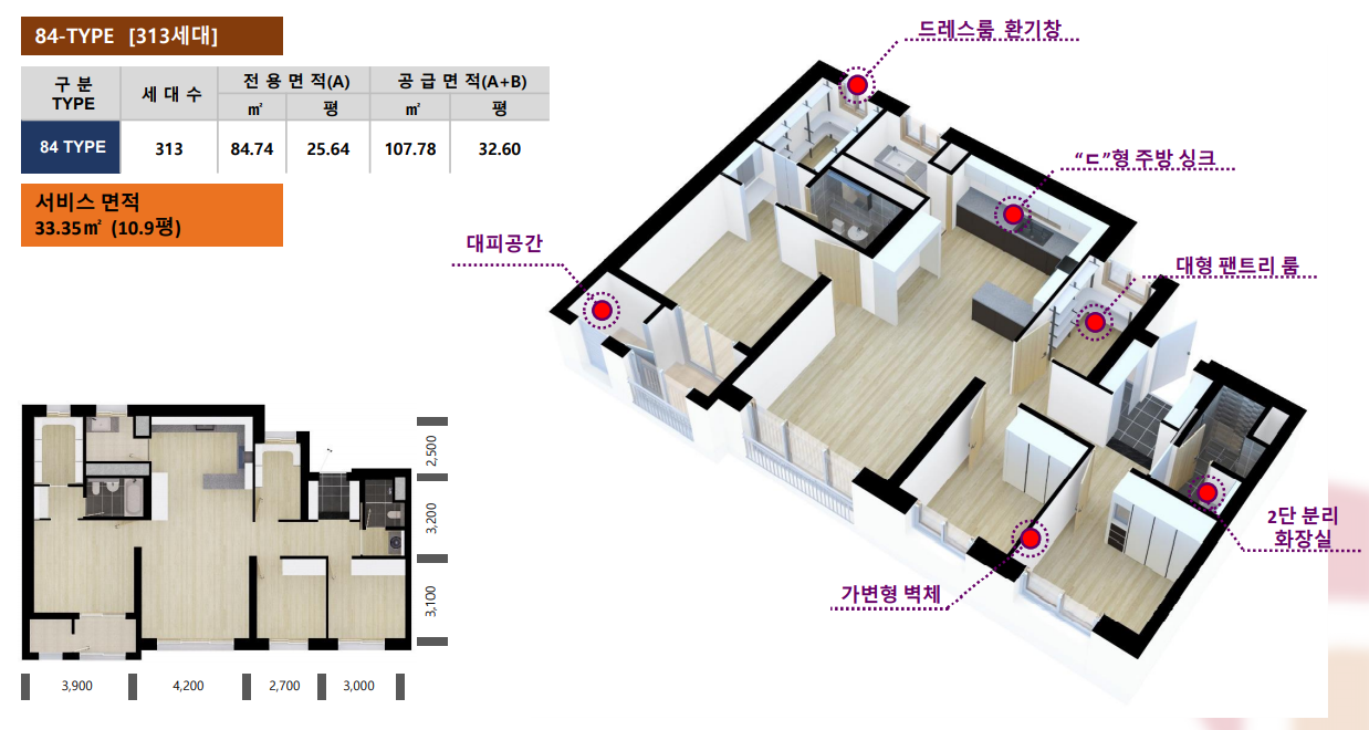 84㎡는 33.35㎡로 약 10여평의 서비스 면적이 들어가며 4BAY구조에 주부들이 선호하시는 ㄷ형 주방싱크가 적용 되었습니다 전세대가 남동 남서향 위주의 판상형 구조로 설계되어 있으므로 채광이 매우 잘 들어올 것으로 예상됩니다