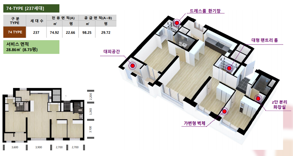 74㎡역시 8평가량의 서비스 면적이 제공되며 2단분리 화장실 가변형벽체 대형팬트리룸이 제공됩니다