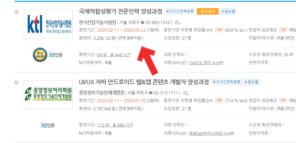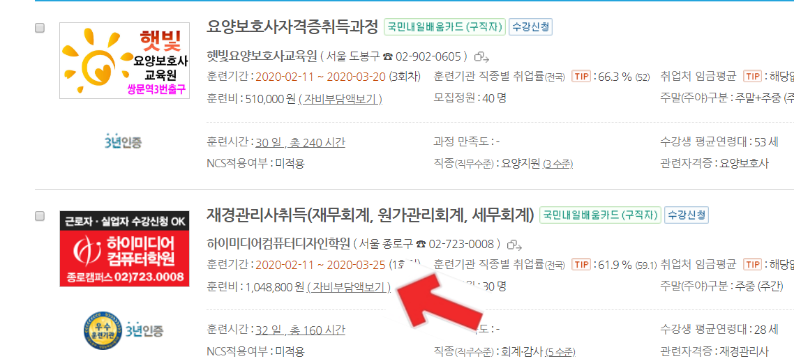 위 사진을 보시면 훈련비에 전액 정부지원을 보실 수 있는데 이것이 무료로 제공되는 교육입니다