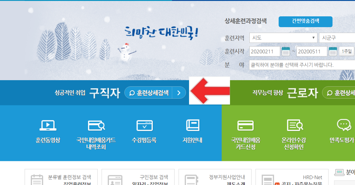 구직자에 해당되시는 분들은 훈련상세검색에서 국비지원무료교육 종류를 보실 수 있고 지원안내를 통해 금액적 혜택정보를 보실 수 있습니다.