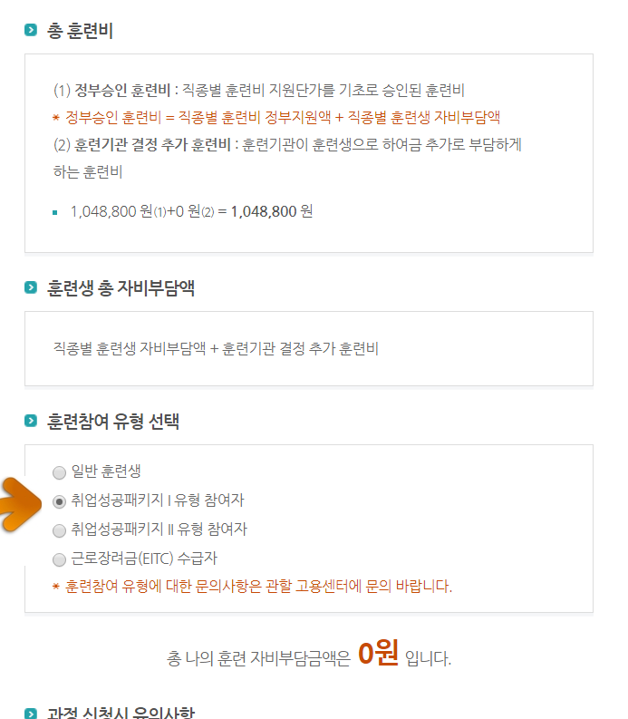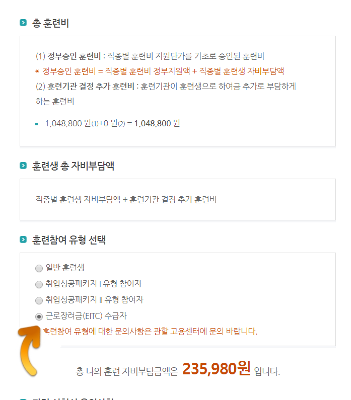 훈련참여 유형선택에서 근로장려금 ( EITC) 수급자를 클릭하시면 총 훈련비 1048800중에 자부담액이 235980원이고 일반 훈련생 (국민내일배움카드로 결제) 시 자부담액은 419520원이됩니다