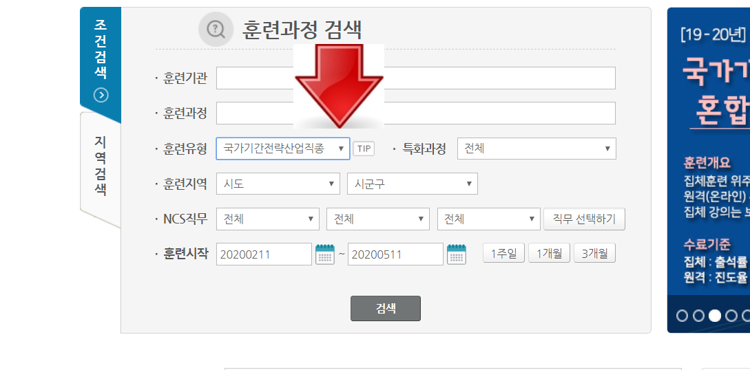 조건검색과 지역검색으로 본인이 희망하는 위치 및 업종을 설정하여 검색 할 수 있습니다 말씀드렸듯이 훈련유형에서 국가기간전략산업직종은 육성을 위해서 정부지원금이 모두 책정되어 있어서 전강의를 무료로 받아보실 수 있습니다. 기관과 과정명은 기입하지 않으셔도 되며 검색을 누르시면 됩니다