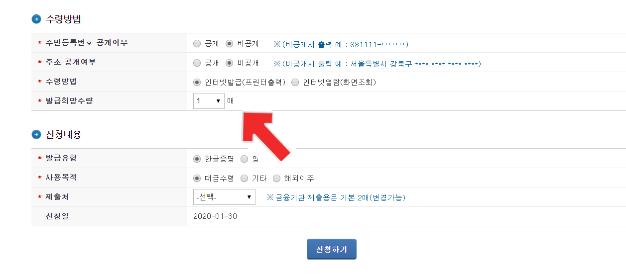 이제 신청 매수를 선택해주세요 수령방법은 인터넷 발급을 클릭해주셔야 합니다 인터넷 열람은 화면에서 확인만할 수 있고 출력이 되지 않습니다