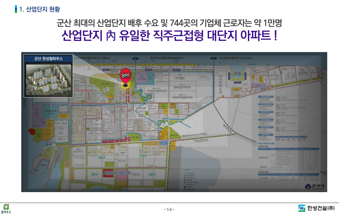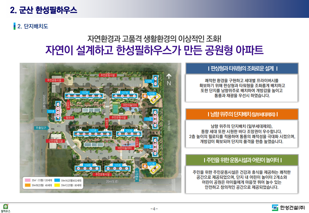한성건설에서 건설한 군산 한성필하우스는 산업단지내 유일한 직주근접형 아파트로서 판상형과 타워형의 조화로운 설계로 건축되었습니다