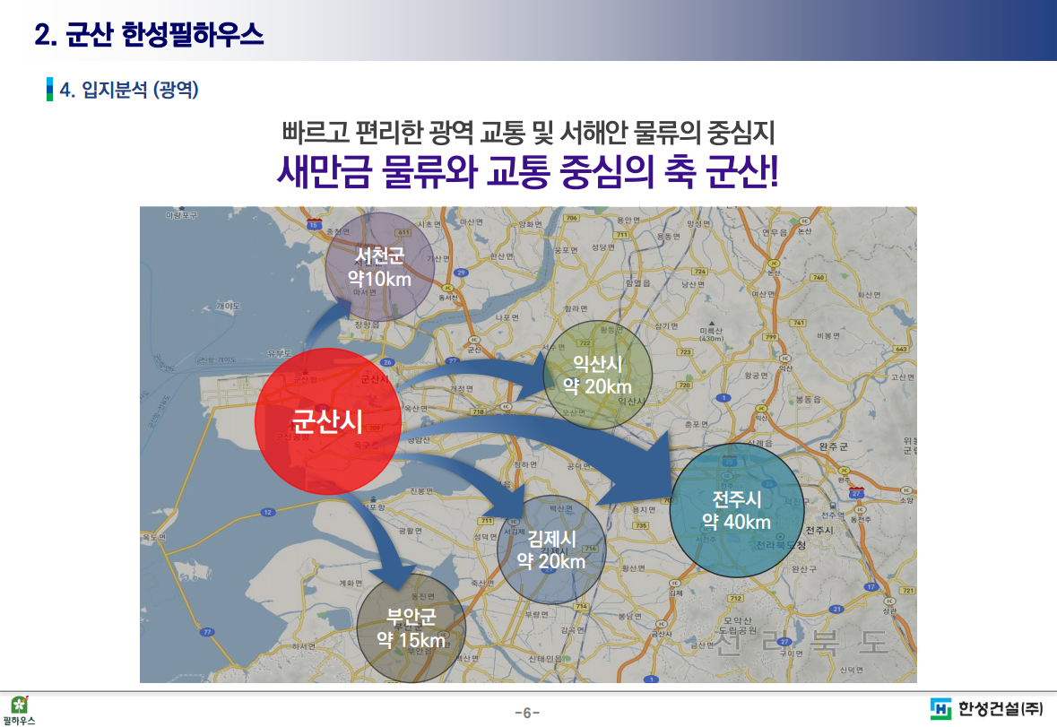 군산은 새만금 물류와 교통의 중심지로 서천,익산,전주,김제 등 인접 산업단지 이동도 빠르게 가능합니다. 군산 한성필하우스 단지 앞으로 21번국도, 4번국도를 통해 군산전역 이동이 편리하고, 서해안 고속도로 군산 IC, 동군산IC 이용이 수월합니다