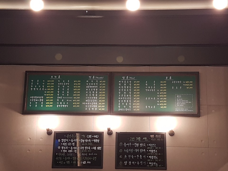 메뉴는 요리류 / 밥류 / 면류 다양하고 많은 편입니다 그냥 짜장면이 5000원으로 가장 저렴합니다 단품메뉴 외 술안주세트메뉴와 2인커플세트메뉴 구성도 괜찮은 편입니다