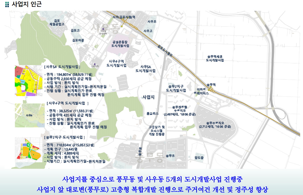 사우 5a와 사우 6 그리고 풍부 1구역을 포함해 풍무 2 센트럴 푸르지오 등 다수의 아파트 개발 사업이 진행 중인 곳에 위치하고 있습니다 현재 주변의 개발이 이렇게 적극적으로 이뤄지고 있는 부분은 향후 주거 환경이 매우 개선될 수밖에 없는 조건이라 해당 지역에 대한 기대감이 높을 수밖에 없는 것 같습니다.
