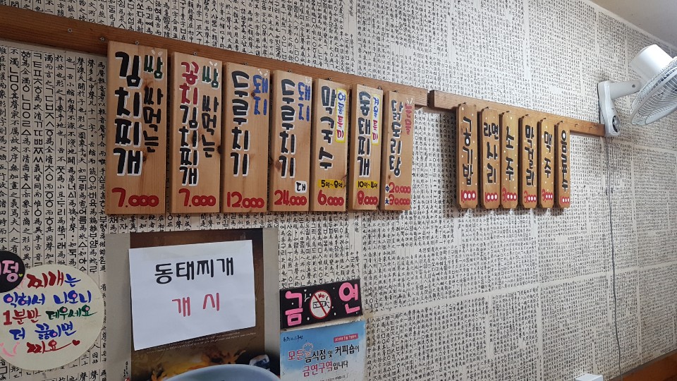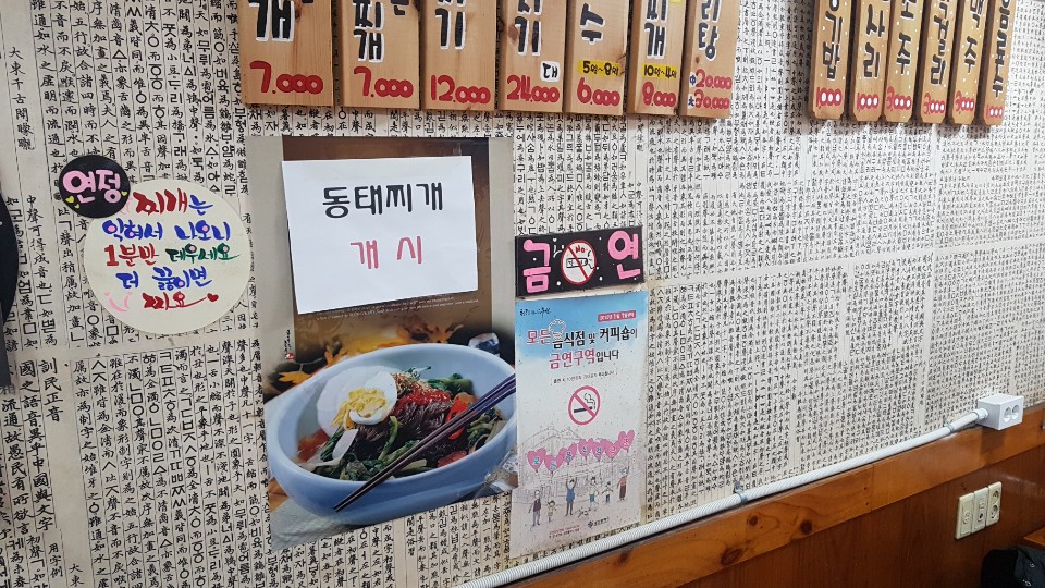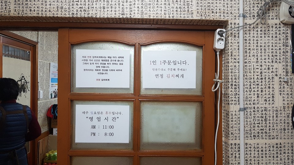 영업시간은 오전 11시부터 저녁8시까지 입니다 매주 일요일은 휴무입니다 저녁에 식사겸 술안주로도 굉장히 좋을것 같은데 재료가 소진되면 마감을 하기 때문에 늦게까지 영업을 하지 않는다고 하네요 가게 곳곳에 신선한 재료를 사용한다는 자신감 있는 문구가 있었습니다 국물이 없으면 김치 두루치기일텐데.. 쌈을 싸먹으려면 국물이 없는 김치찌개가 나오려나 매우 궁금했습니다