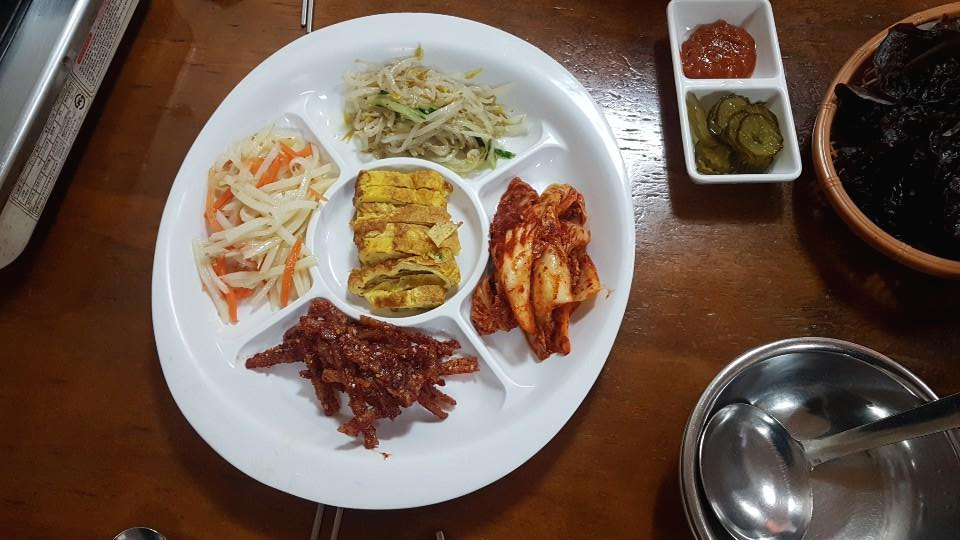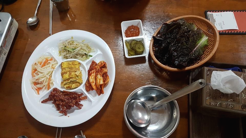 기본찬이 나왔습니다 푸짐하게 나오고 리필도 가능합니다 반찬을 먹으면서 느낌음 정직한맛이라는 느낌 특별한건 없지만 찬 하나하나 기본맛에 충실하면서 자극적이지 않고 맛이 좋았습니다 그리고 궁금했던 함께나온 피클의 정체는 쌈에 함께 싸먹는 것이었습니다