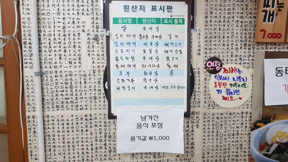 원산지 표기 입니다 연정김치찌개는 식재료에 대한 원산지를 절대 속이지 않는다고 합니다 남긴 음식은 포장도 가능하다고 하네요