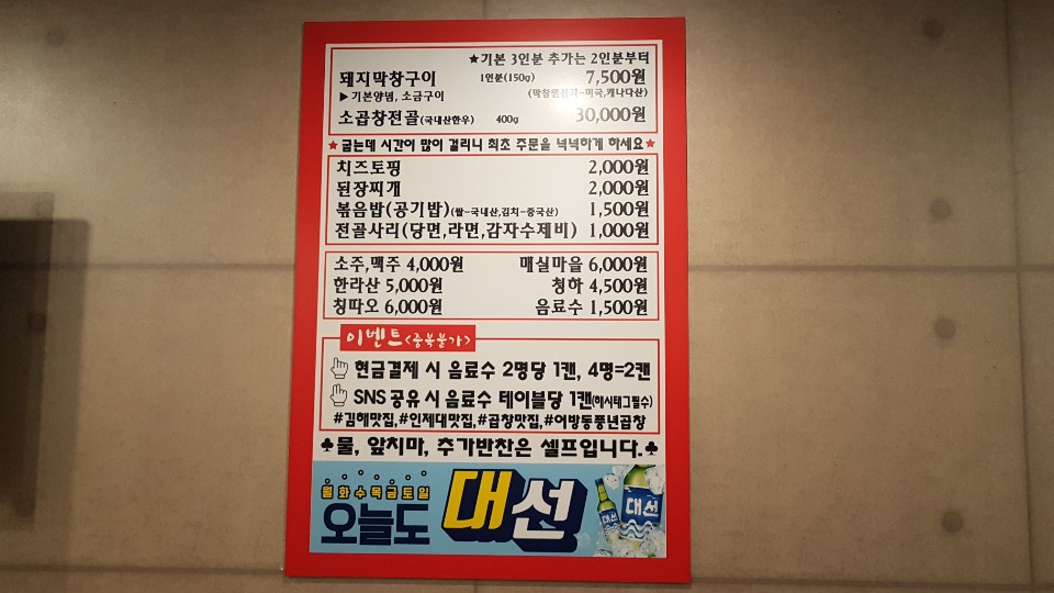 막창구이 1인분 7500원 소고창전골 30000원 가격도 저렴하니 괜찬은것 같습니다
