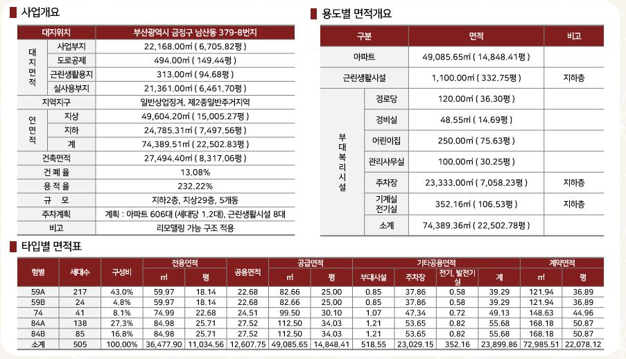 부산광역시에 위치한 동래구 남산동 379-8번지에 들어설 예정이며 지하 2층~지상 29층 5개동으로 완공될 예정입니다
