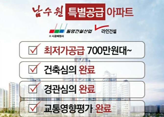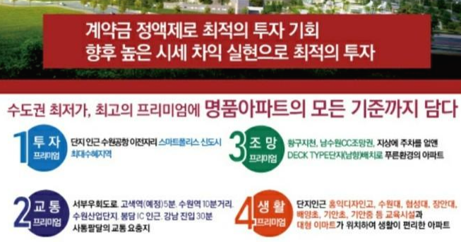 수원에 있는 아파트에 비해서 비교적 합리적인 분양가로 내집 마련의 꿈을 실현할 수 있는기회! 쾌적한 생활환경은 물론이고 각종 개발및 교통호재로 실수요자 그리고 투자자 모두를 만족시킬 소식에 주목해주시길 바랍니다