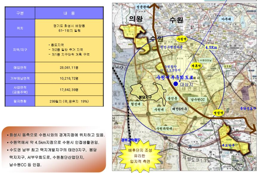 수원 공군 비행장의 이전이 확정되며 스마트 폴리스가 완공되고 난 후에는 국제 의료복합단지와 생태농업공원, 문화공원, 첨단교통수단 등 다양한 인프라가 조성되어 사업지의 가치가 더욱 상승할 예정입니다.