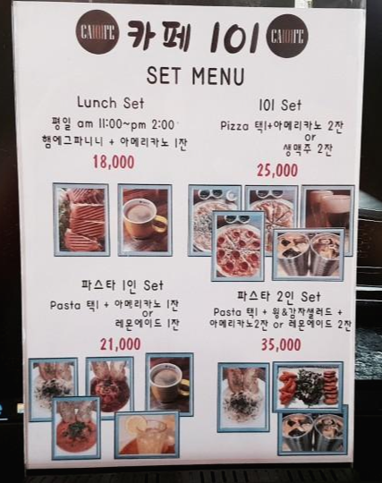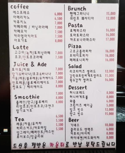 가격대는 에스프레소 6500원부터 시작해서 7000원 8000원대이고 저렴한 5500원정도의 티종류도 있습니다 이정도면 서울근교 대형카페들보다는 나름 착한가격이네요 그외 피자 파스타 파니니 샐러드등의 메뉴와 런치세트등의 메뉴등이 구성되어 있습니다
