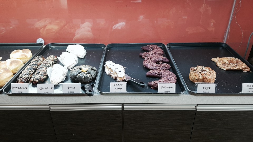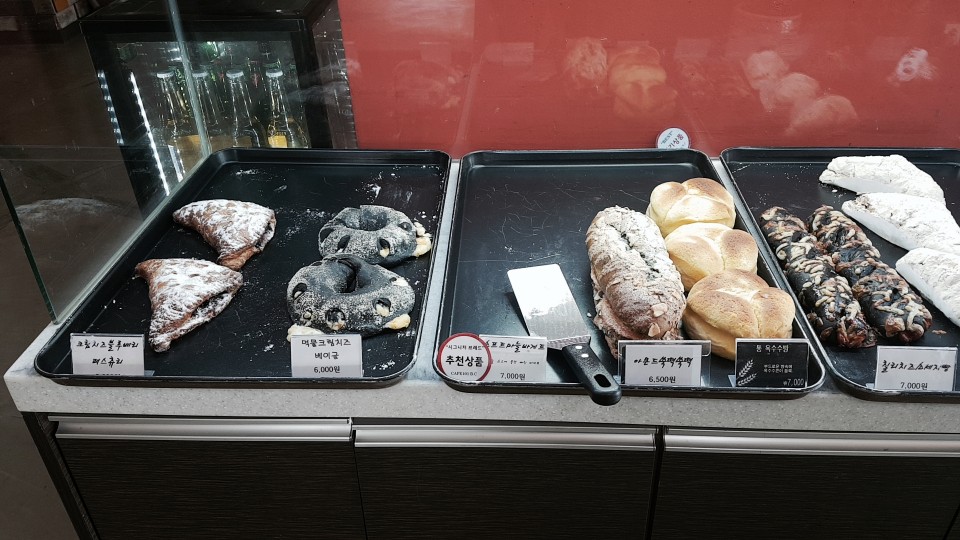 베이커리 카페답게 직접구운 빵을 판매하고 있습니다 이곳 베이커리 인기가 좋아서 빵드시는 분들이 굉장히 많으셨습니다 다 소진되면 새로 구운 빵들이 다시 진열되는 모습을 볼 수 있었습니다 빵가격대도 7000~8000원대 입니다