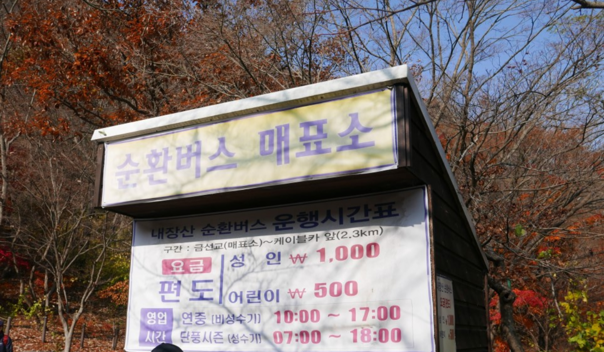 내장산 입구에서 케이블카 승강장 까지는 조금 걸어들어가셔야 합니다 공원입구에서 순환버스를 이용해 케이블카 승강장까지 가실수 있습니다 이용요금은 성인 1000원 어린이 500원입니다