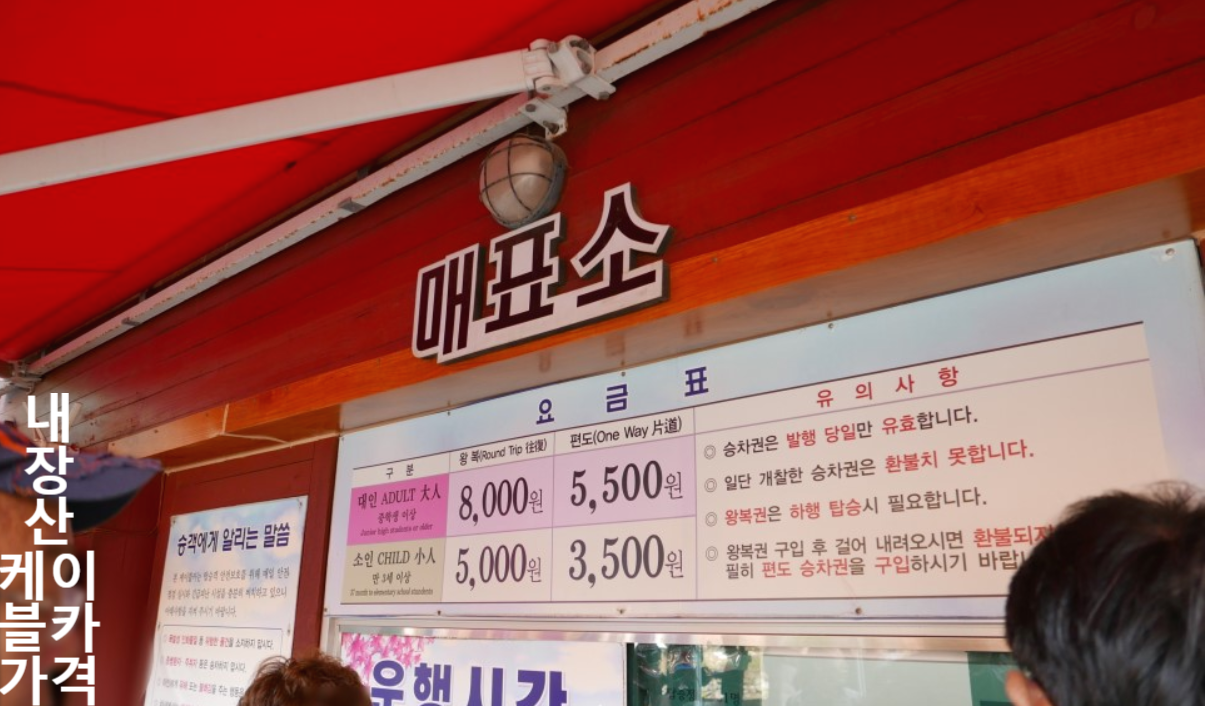 케이블카 요금은 성인 왕복 8000원 편도 5500원 소인 왕복5000원 편도 3500원입니다 왕복권구입시 걸어내려오신다 해도 환불이 되지 않으니 잘 생각해 보시고 표를 사셔야 할 것 같습니다 걸어내려와서 환불해달라고 하시는 분이 많으신가 봅니다 안내문구가 크게 써있습니다 케이블카 소요시간은 5분정도 걸린다고 합니다 운행시간은 오전 7시부터 오후 6시까지입니다