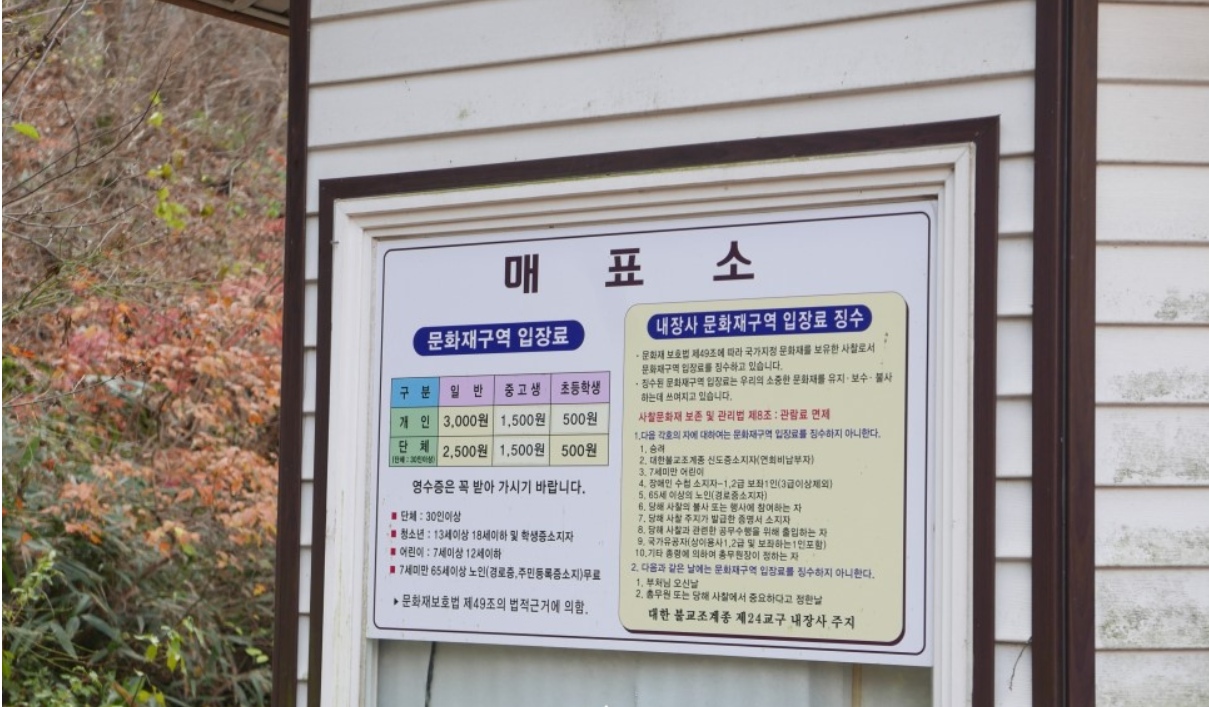 내장산 입장료 가격입니다 카드사용이 불가 하므로 꼭 현금을 챙기셔야 합니다 그리고 등산코스를 이용하신다면 무료로 표를 안내고 이용 할 수 있다고 합니다 그리고 65세 이상은 무료 신분증 확인이 필요합니다