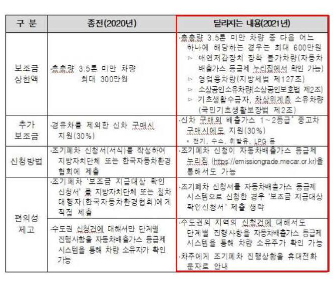 매연 저감장치 장착을 할 수 없는 차량 , 기초생활수급자 등 저소득층 차량 및 소상공인 소유 차량은 기존에는 폐차 시 보조금이 210만 원, 1,2등급 차량 구매 시 90만 원이 합쳐져 최대 300만 원 지원이 가능했다면 개편된 지원금 제도에서는 각각 420만 원, 180만 원까지 최대 600만원까지 지원받을 수 있게 되었습니다
