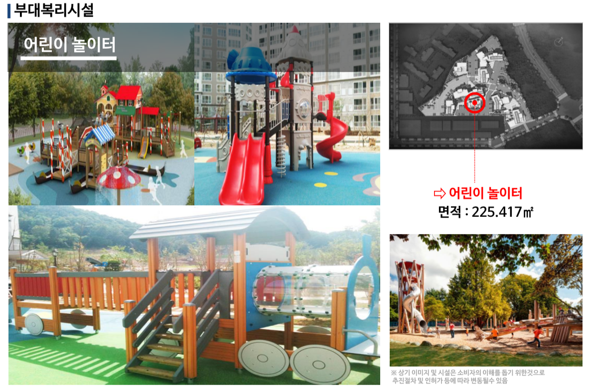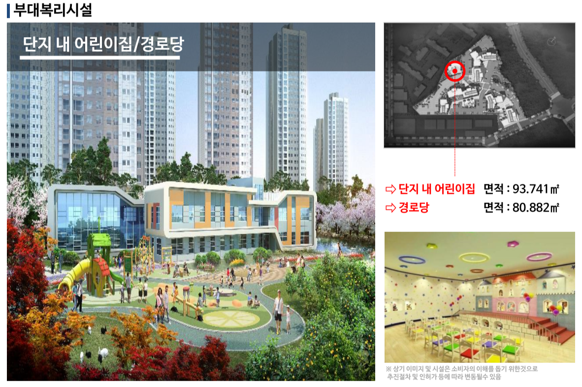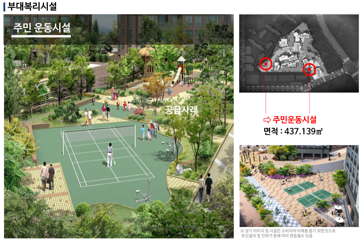 단지 내에 부대복리시설로는 어린이들을 위한 놀이터와 어른을 위한 다양한 스포츠 시설 그리고 단지내 어린이집과 경로당이 있습니다