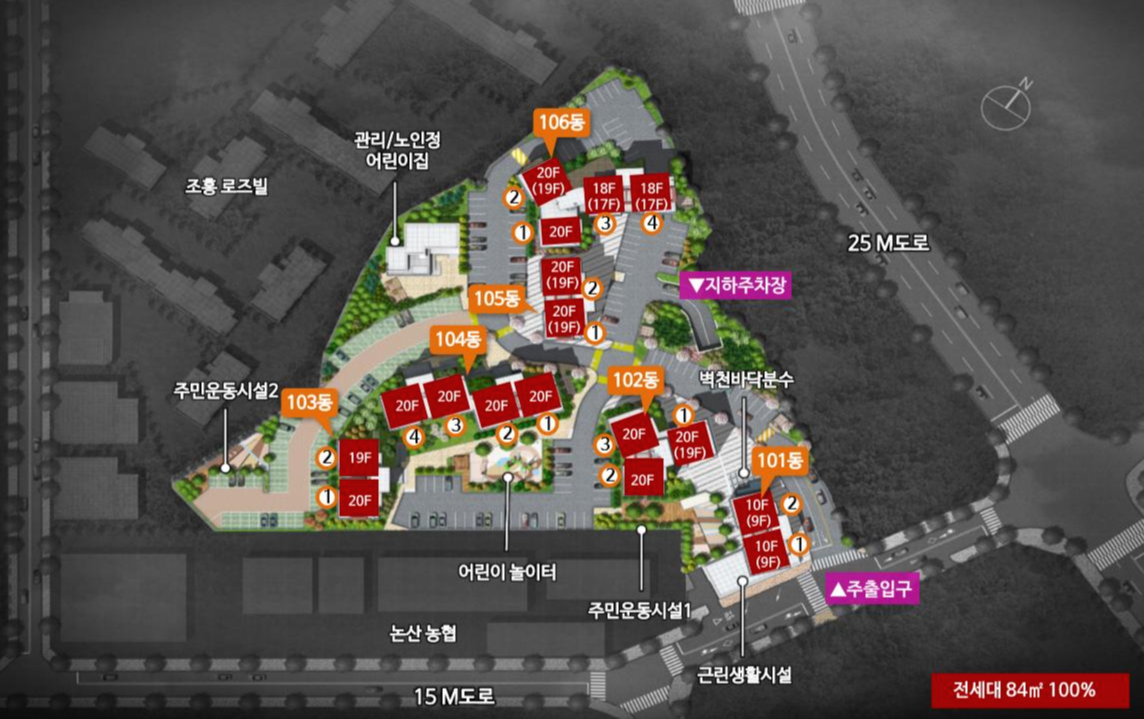 단지 배치도를 보시면 지상 20층까지 조성된 높은 아파트에 동 간격도 넓어서 조망이 좋은 것은 물론 사생활 침해 걱정도 없습니다.