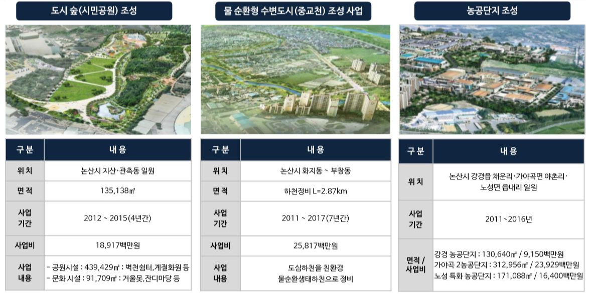 현재 진행 중인 사업으로 도시 숲 시민공원 조성과 물 순환형 수변도시 조성사업 , 농공단지 조성 등 다양한 개발사업으로 새로운 문화시설 확충과 시민휴식공간 그리고 유망기업 유치로 일자리 창출 및 지역경제 활성화를 도모 하고 있습니다