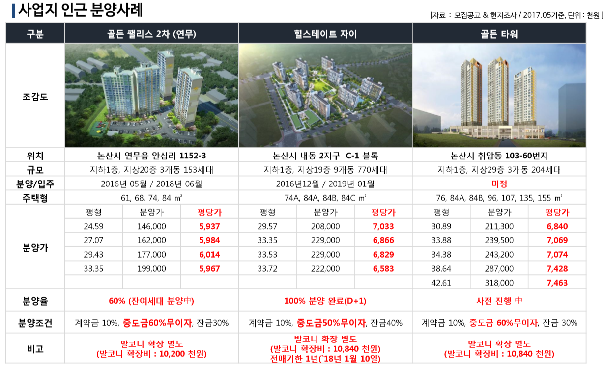 이곳 논산 수린나 아파트는 실거주의 목적도 있겠지만 투자목적으로 볼때 위의 단지 인근 골든팰리스2차, 힐스테이트 자이, 골든타워, 인터불고 코아루2차, 트리체 등의 신축 아파트와 분양가를 비교한 표를 보면 알수 있듯 향후 많은 시세 차익을 볼수 있을 만큼 미래 가치 또한 뛰어나다고 할수 있습니다.