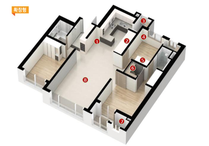 넉넉한 식탁공간확보와 비상대피공간 냉장고 김치냉장고 수납공간 및 주방팬트리까지 공간활용을 잘 한점이 돋보이는 구조입니다