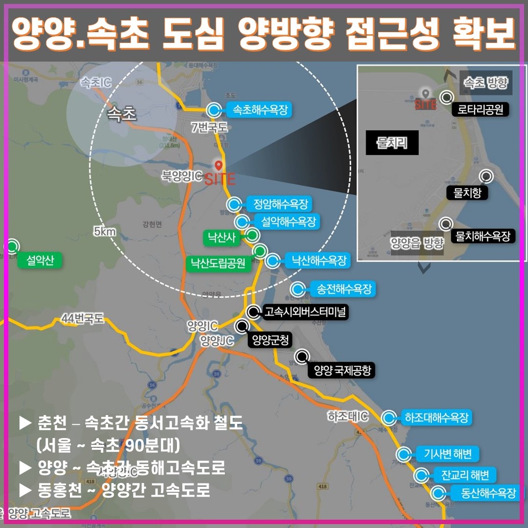 서울-양양 고속도로 개통으로 수도권에서 90분 거리, 동해고속도로, 7번 국도, 동서고속화철도(27년 예정)로 어디서나 빠른 접근성으로 동해선 개통(27년도 예정_으로 수도권과 부산이 모두 2시간대로 기대해 볼 수 있겠습니다