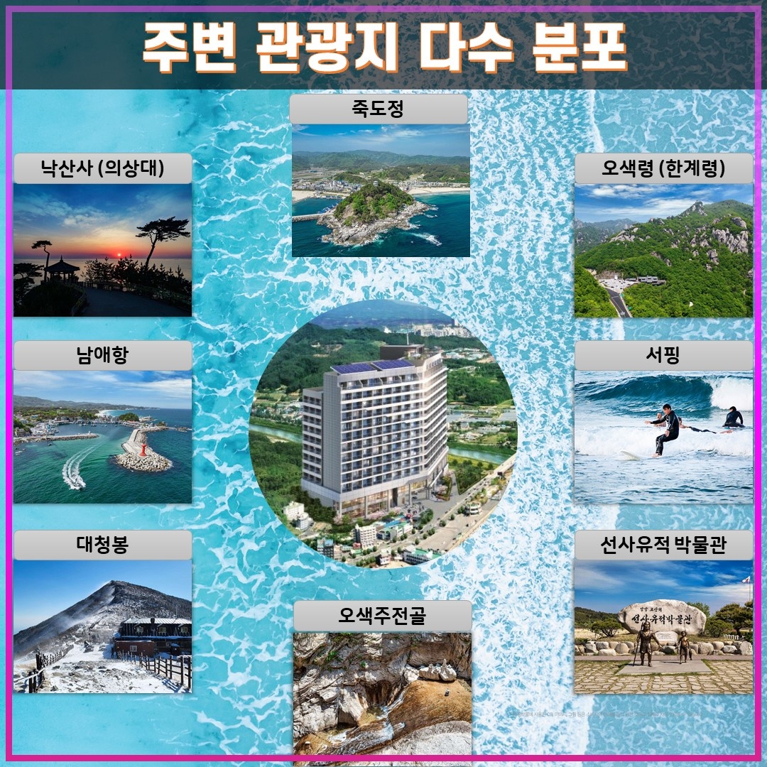 -양양은 서퍼들의 성지이자, 위로는 속초 아래로 강릉까지 이어지는 한 해 2,000만 명이 찾는 강원 관광 인프라의 중심입니다 또한 주변에 설악산 국립공원과 낙산사, 강릉, 경포대, 대포항 전망대 등 다수의 관광지가 밀집해 있습니다