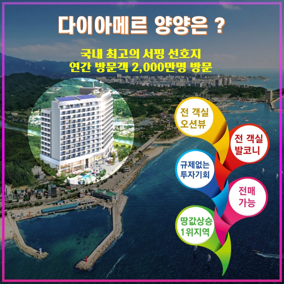 아름다운 동해의 바다를 더 가깝게 만날 수 있는 다이아메르 양양은 생활형 숙박시설로서 전매제한이나 종부세, 1가구 2주택 규제 등이 없어서 진입장벽이 매우 낮은 점을 장점으로 꼽힙니다