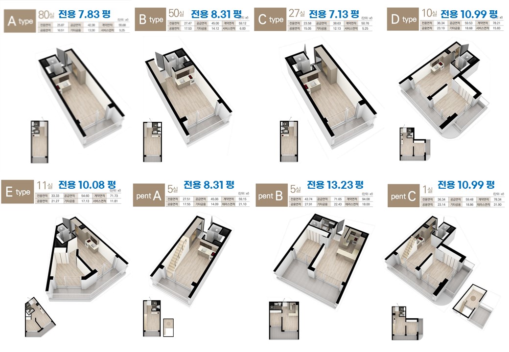 -다양한 평면 구성으로 1룸, 1.5룸, 펜트하우스 등 8개 타입의 다양한 평면구성으로 취향에 맞춘 효율적인 공간을 제공합니다