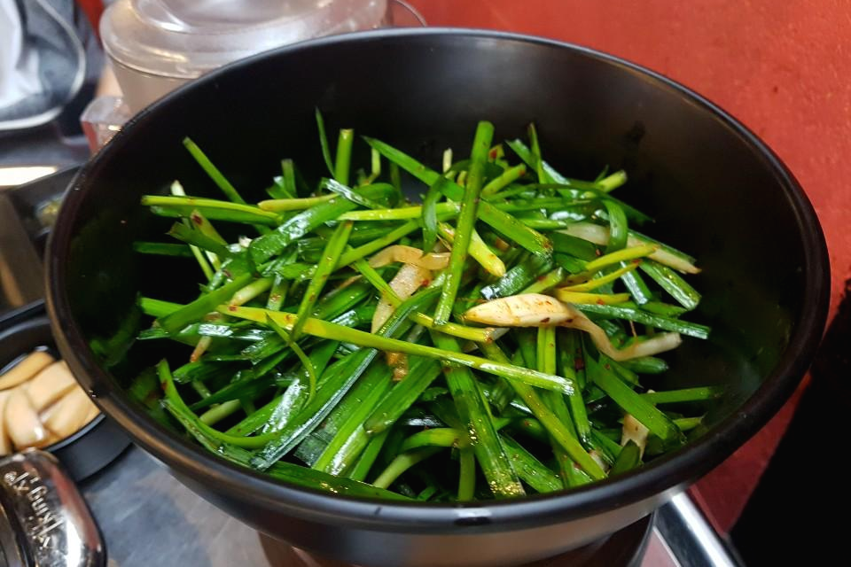 그리고 나서 길을 낸 후 부추를 올려주시고 김치도 올려주십니다 그냥 먹으면 많이 느끼 할 수 있지만 부추랑 김치랑 먹으면 맛있게 드실 수 있습니다