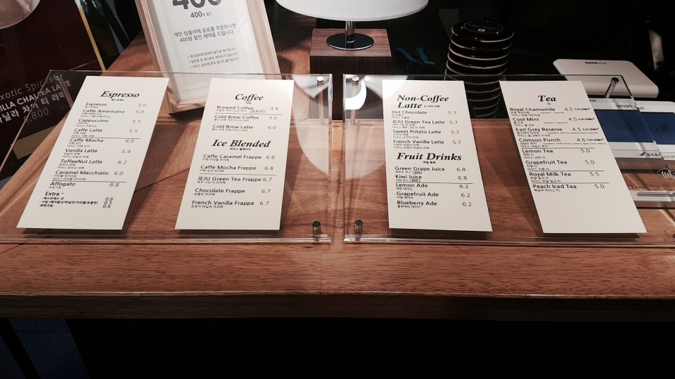 아메리카노 5000원 카페라떼 5500원 로얄캐모마일 4500원 오늘의커피 4800원 콜드브루커피 5500원 초콜릿5700원 제주그린티라떼 5700원 고구마라떼 5700원 프렌치바닐라라떼 5700원