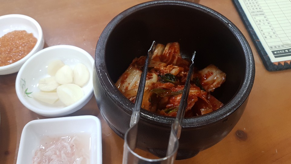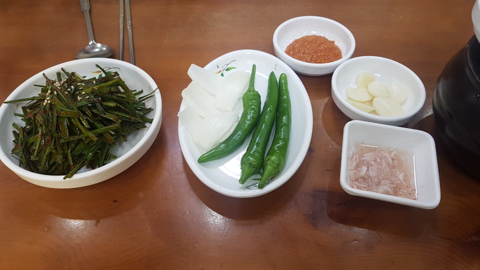 부추 새우젓 마늘 쌈장 고추와 양파 청량고추를 따로 달라고 말씀드렸더니 가져다 주셨습니다