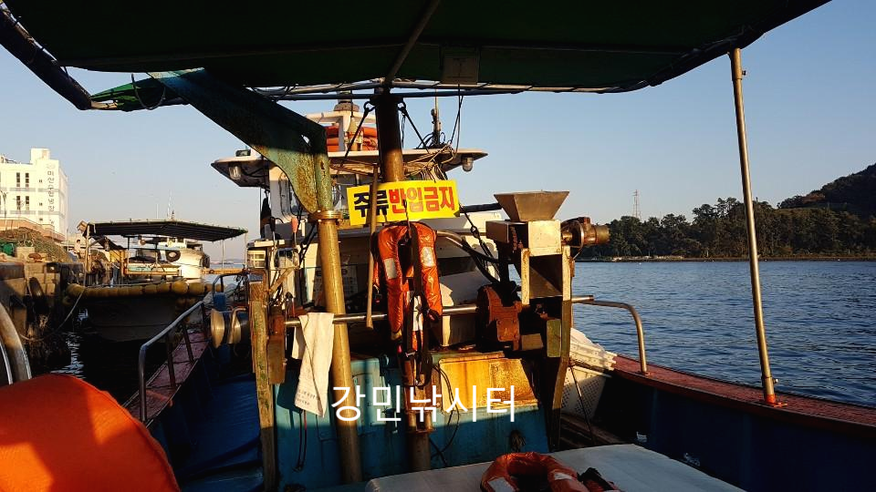 강민낚시터는 경남 창원시 구산면에 위치한 낚시터입니다 성수기인 6~9월에는 예약이 필수입니다 저는 당일에 문의로를 드리고 예약을 하고 이용했습니다 주소를 찍고 도착을 한 후 원전공용 주차장에 주차를 했습니다 그리고 선장님을 만나 배를타고 바다좌대낚시터로 이동을 하는데 운항시간은 5분정도 입니다