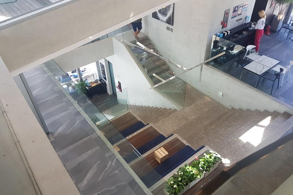 건물 내부도 굉장히 독특한 구조로 지어져서 센스있게 계단에도 앉을 수 있는 공간이 있었습니다 건물 안에서도 테라스를 이용하실 수 있도록 만들어져 있는 건 물론이고 엘리베이터 없이 루프탑까지 걸어서 올라갔다 내려갔다 이동해 보았지만 신기하게도 오르락내리락한다는 느낌이 들지 않을 정도였습니다 복층 느낌으로 층이 구분이 되어있다기보다 연결되어 있다는 느낌이 커서 그런 것 같습니다